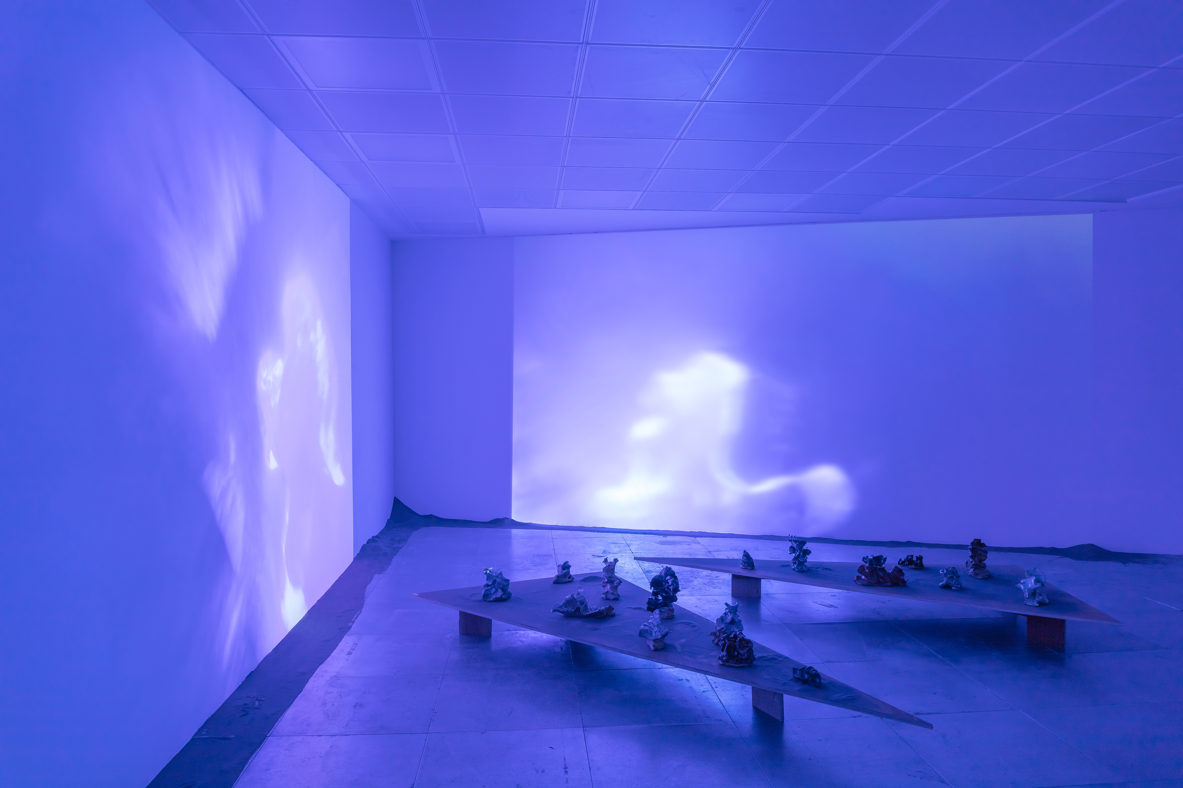 The exhibition design was developed in collaboration with the artist, presenting two triangular plinths covered in black sand on which the sculptures were showcased. The plinths acted as anchor points, assuming multiple possible positions within the gallery space. Their angular shapes allowed for unexpected forms of interaction by the performers. Two benches completed the set by providing informal viewing points towards the video projections.